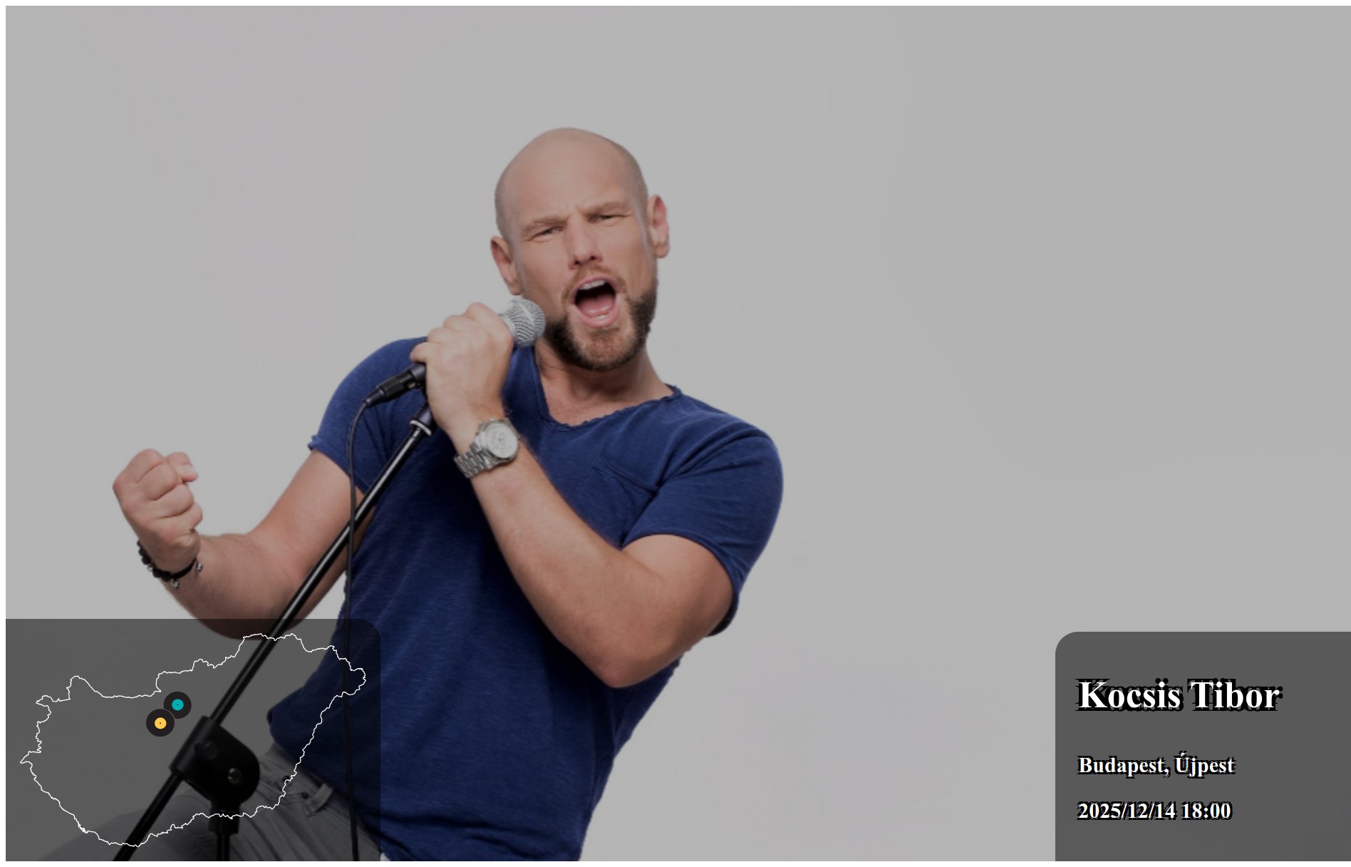 Kocsis Tibor 2025/12/23 19:00 Orfeum fellépés Budapest Orfeum 2025/12/23 19:00 kezdettel Kocsis Tibor fellépése Budapest településen Orfeum helyszínen kerül megrendezésre. Az esemény Nyilvános belépőjegyes rendezvény zárt helyiségben. 2025.12.23 19:00 UTC+1