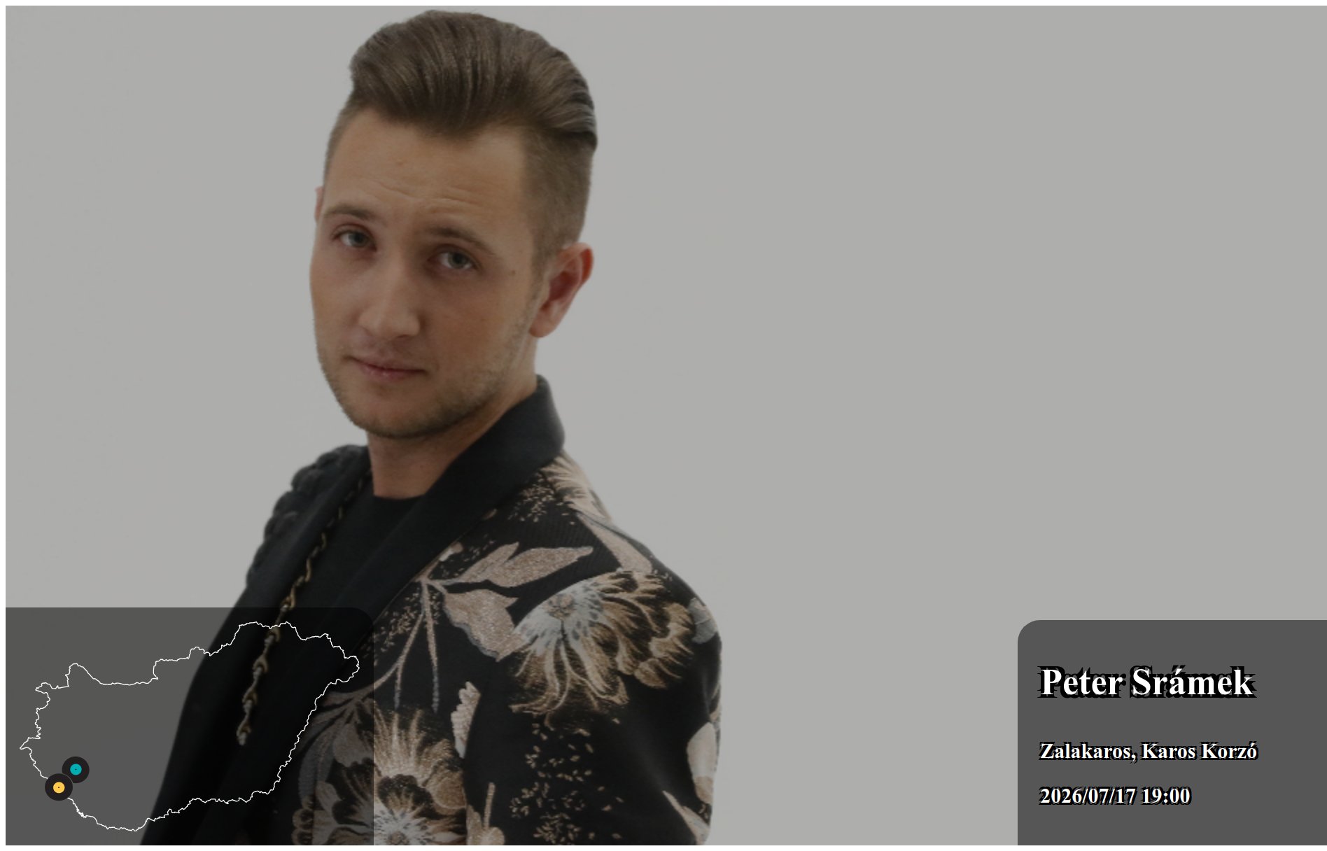 Peter Srámek 2026/07/18 21:15 élő koncert Karácsond Szabadtér Hősők tere 1 2026/07/18 21:15 kezdettel Peter Srámek fellépése Karácsond településen helyszínen kerül megrendezésre. Az esemény Nyilvános belépőjegyes rendezvény zárt helyiségben. 2026.07.18 21:15 UTC+2