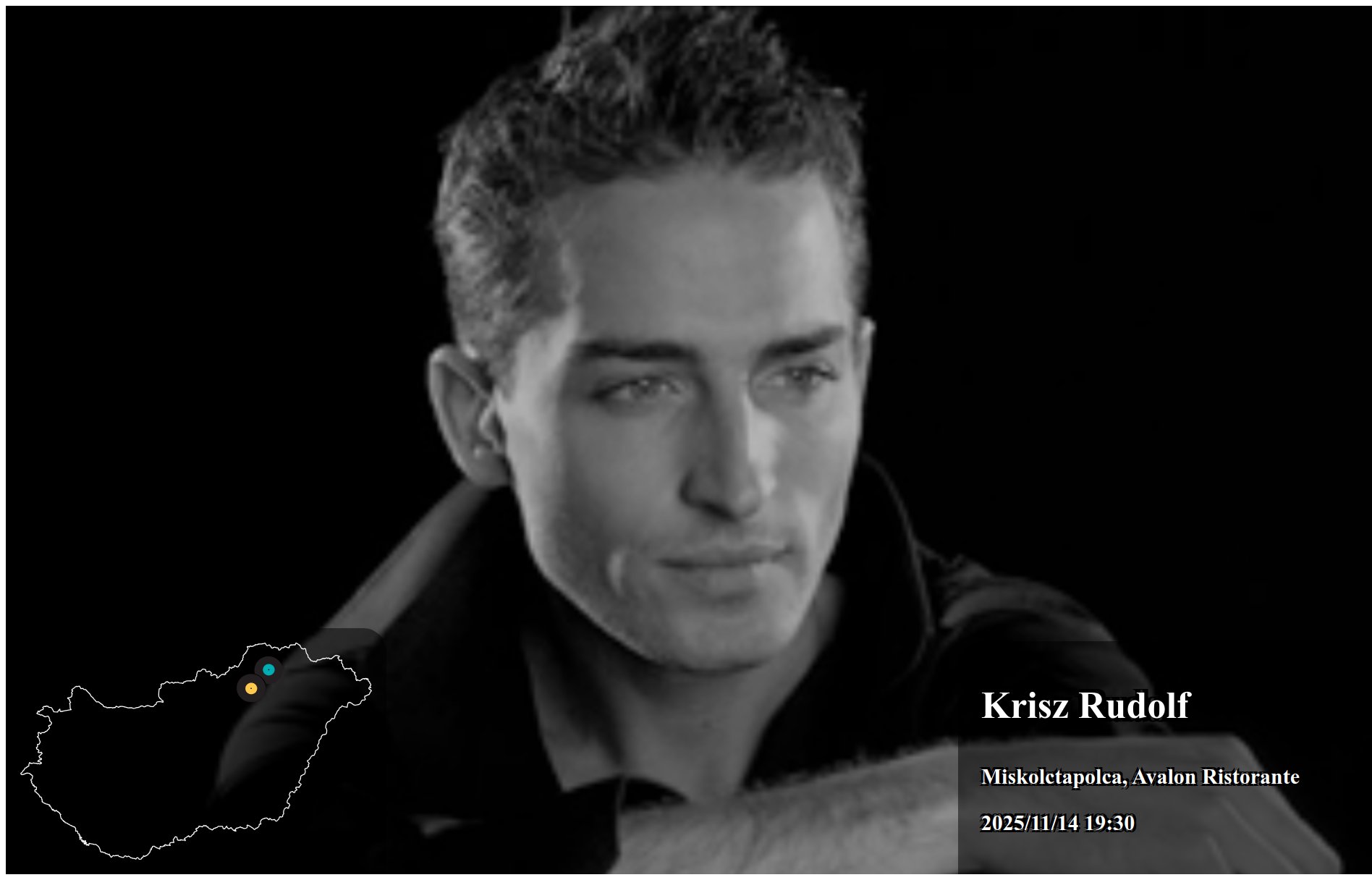 Az itt megjelenő eseményeket a produkció, vagy annak képviselője rögzítette. Az oldalon lévő információk valódiságáért a Koncertbooking.com ennek kapcsán felelősséget nem tud vállalni. Indulás előtt ellenőrizze az adott település vagy eseményhelyszín oldalán is a rendezvény paramétereit.