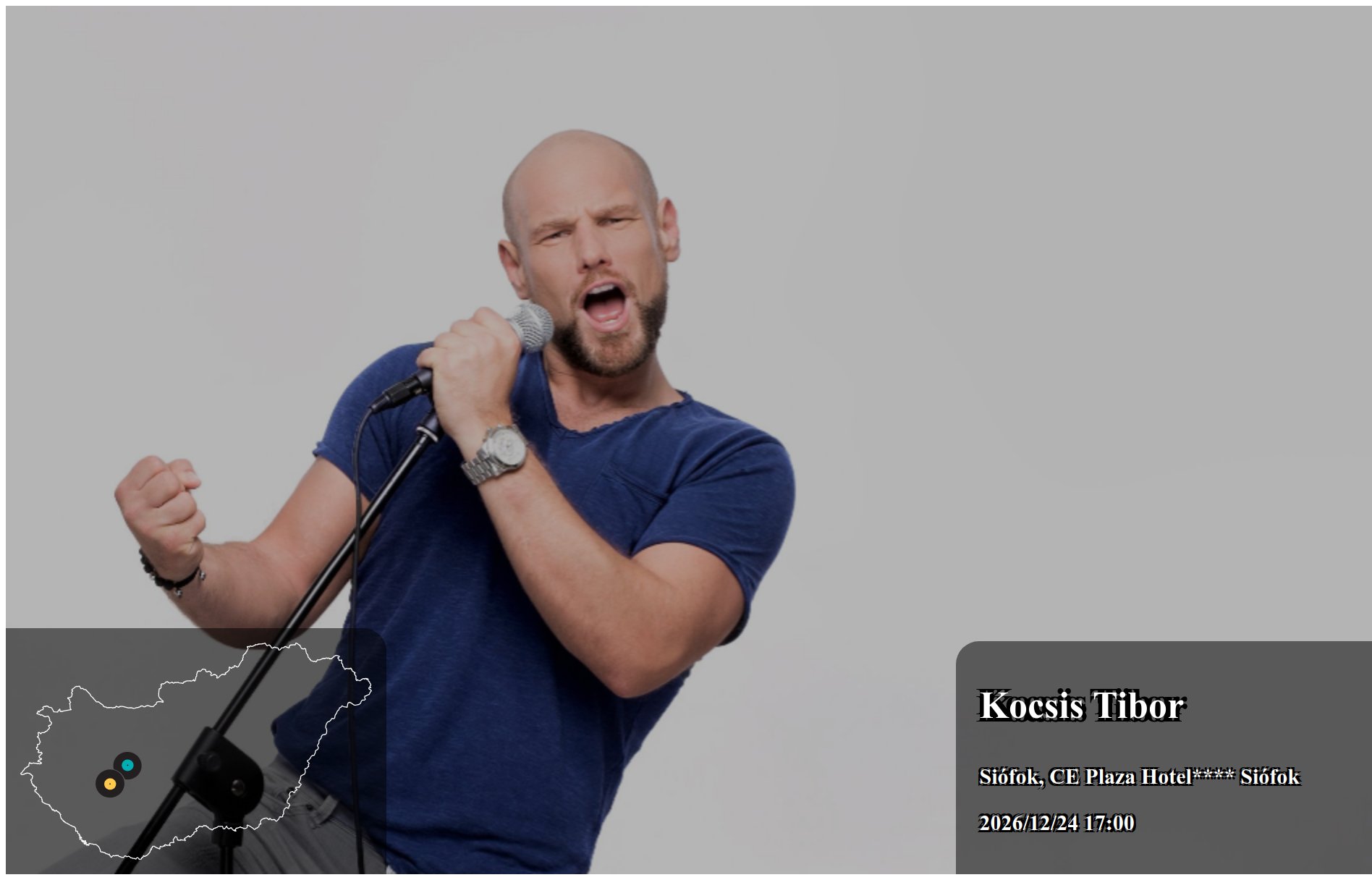 Az itt megjelenő eseményeket a produkció, vagy annak képviselője rögzítette. Az oldalon lévő információk valódiságáért a Koncertbooking.com ennek kapcsán felelősséget nem tud vállalni. Indulás előtt ellenőrizze az adott település vagy eseményhelyszín oldalán is a rendezvény paramétereit.