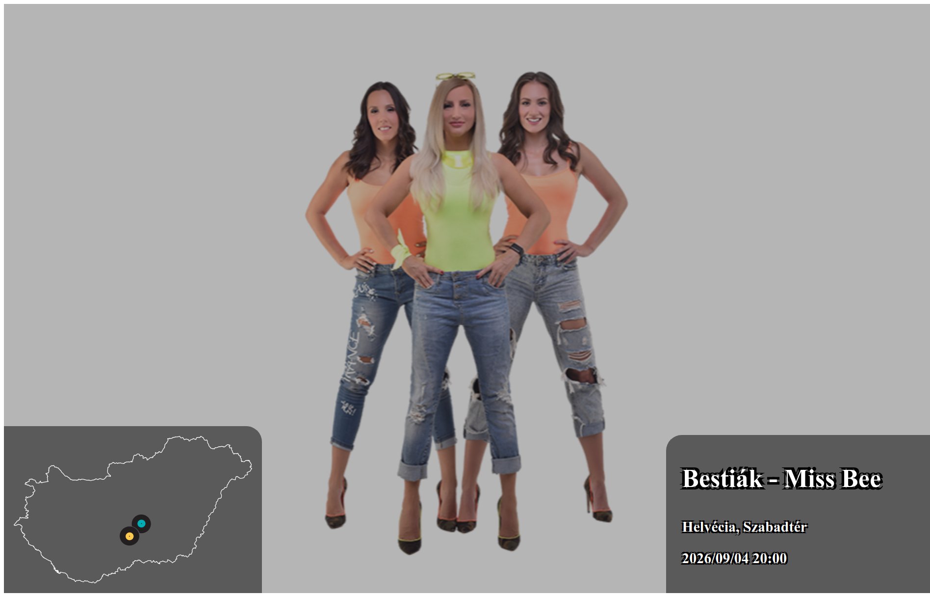 Az itt megjelenő eseményeket a produkció, vagy annak képviselője rögzítette. Az oldalon lévő információk valódiságáért a Koncertbooking.com ennek kapcsán felelősséget nem tud vállalni. Indulás előtt ellenőrizze az adott település vagy eseményhelyszín oldalán is a rendezvény paramétereit.
