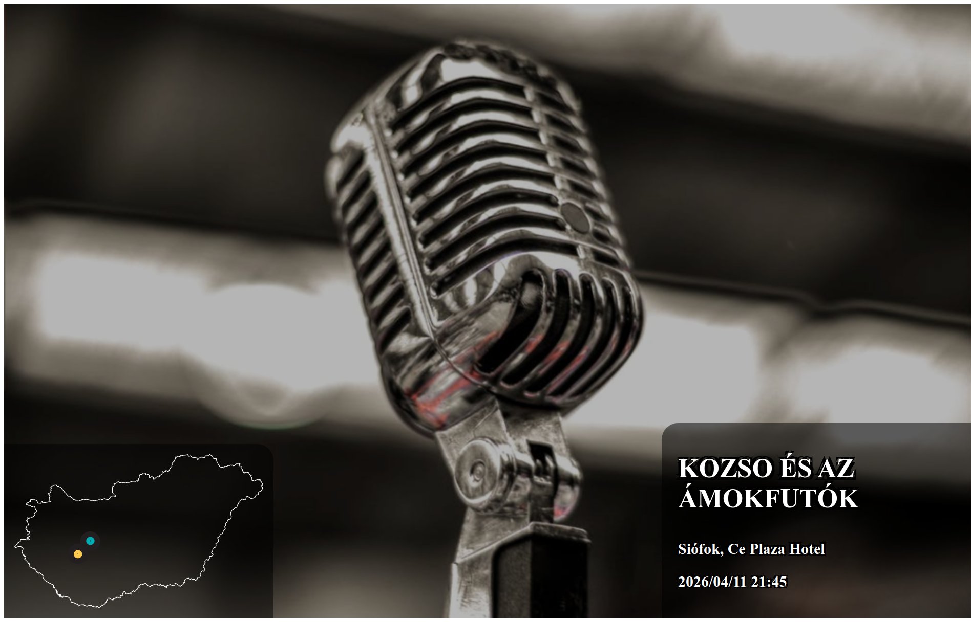 Az itt megjelenő eseményeket a produkció, vagy annak képviselője rögzítette. Az oldalon lévő információk valódiságáért a Koncertbooking.com ennek kapcsán felelősséget nem tud vállalni. Indulás előtt ellenőrizze az adott település vagy eseményhelyszín oldalán is a rendezvény paramétereit.