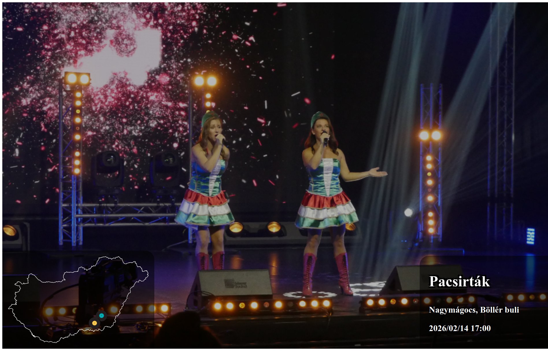 Az itt megjelenő eseményeket a produkció, vagy annak képviselője rögzítette. Az oldalon lévő információk valódiságáért a Koncertbooking.com ennek kapcsán felelősséget nem tud vállalni. Indulás előtt ellenőrizze az adott település vagy eseményhelyszín oldalán is a rendezvény paramétereit.