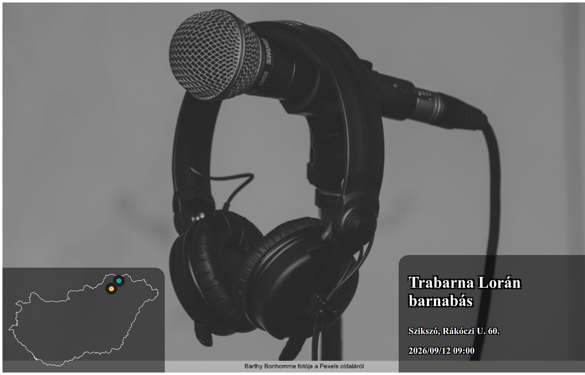 Az itt megjelenő eseményeket a produkció, vagy annak képviselője rögzítette. Az oldalon lévő információk valódiságáért a Koncertbooking.com ennek kapcsán felelősséget nem tud vállalni. Indulás előtt ellenőrizze az adott település vagy eseményhelyszín oldalán is a rendezvény paramétereit.