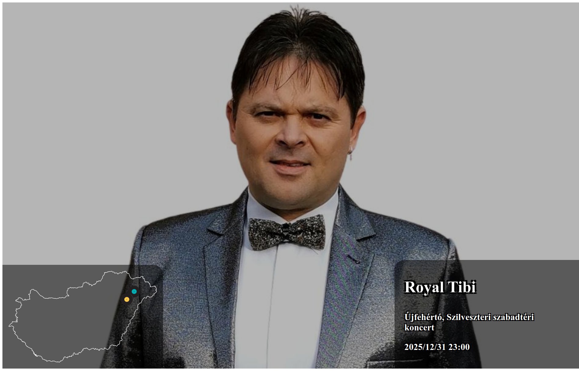 2024/11/16 21:00 kezdettel Royal Tibi fellépése Zalakaros településen Wellness Sláger TV helyszínen kerül megrendezésre. Az esemény Nyilvános belépőjegyes rendezvény zárt helyiségben.